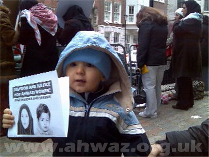 Groups representing Ahwazis are seeking to bring attention to the plight of two Ahwazi women currently imprisoned by the regime: Masouma Kaabi and Sakina Niassi. Masouma, 28, is being held in custody with her four-year-old son Aimad (both pictured above) and her mother-in-law. The women and baby have been imprisoned to punish Ahwazi political activist Habib Nabgani, Masouma's husband and Aimad's father, but Aimad is reported to have fallen ill due to poor prison conditions.